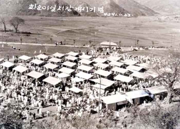 ¿¾ ȼø 5ÀÏ ½ÃÀå Àü°æÀÌ´Ù. ¿¾ ȼø 5ÀÏ ½ÃÀåÀº ȼøÀ¾ ½Å±â¸®(Çö ȼø±³À°Ã» Á¤¹® ¾Æ·¡ÂÊ¿¡ ÀÚ¸®Àâ°í ÀÖ¾úÀ¸³ª Àå¼Ò°¡ ÇùÁ¶ÇÏ¿© 1958³âµµ¿¡ »ïõ¸®(¼º¾È)À¸·Î ½ÃÀåÀ» ÀÌÀü ÇöÀç¿¡ À̸£°í ÀÖ´Ù.