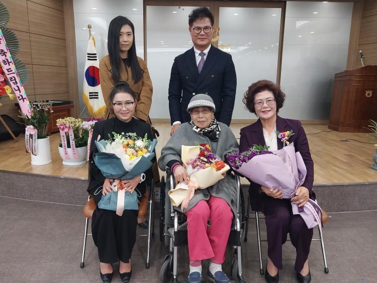 ÇÑÆí, ½ÅÀÓ ¹ÚÈñ¿Á ȸÀåÀÇ 90¼¼ ³ë¸ð°¡ Âü¼®ÇÏ¿© µþÀÇ ÃëÀÓÀ» °¨°Ý½º·± ¸ð½ÀÀ¸·Î ¹Ù¶óº¸¾Ò°í, ¹Ú ȸÀåÀº ¾î¸Ó´Ï¸¦ ¼Ò°³ÇÏ¸é¼ ¸ðÁ¤¿¡ ´ëÇÑ ¿ï¸Ô°Å¸²À¸·Î °¡½¿¹¶Å¬ÇÑ ÃëÀÓ½ÄÀ» ¼ö³õ¾Ò´Ù.